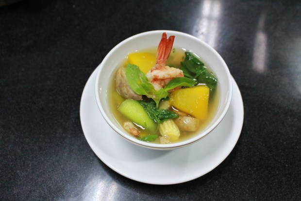 ๓. เมื่อน้ำซุปเดือด ปรุงรสด้วยน้ำปลา รอสักพักจึงใส่กุ้งและผักสดลงไป